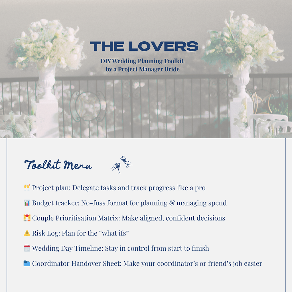 This isn’t just another checklist. It’s a proven project management framework reimagined for weddings – giving you clarity, structure, and confidence from “yes” to “I do.