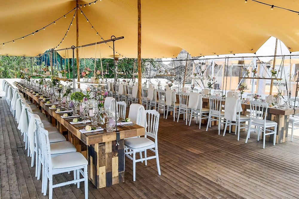 Stretch Tents: Our versatile outdoor stretch tents come in four sizes (7.5m x 10m to 30m x 10m), hosting up to 200 guests affordably—perfect for intimate gatherings or grand receptions, adapting effortlessly to your venue.
